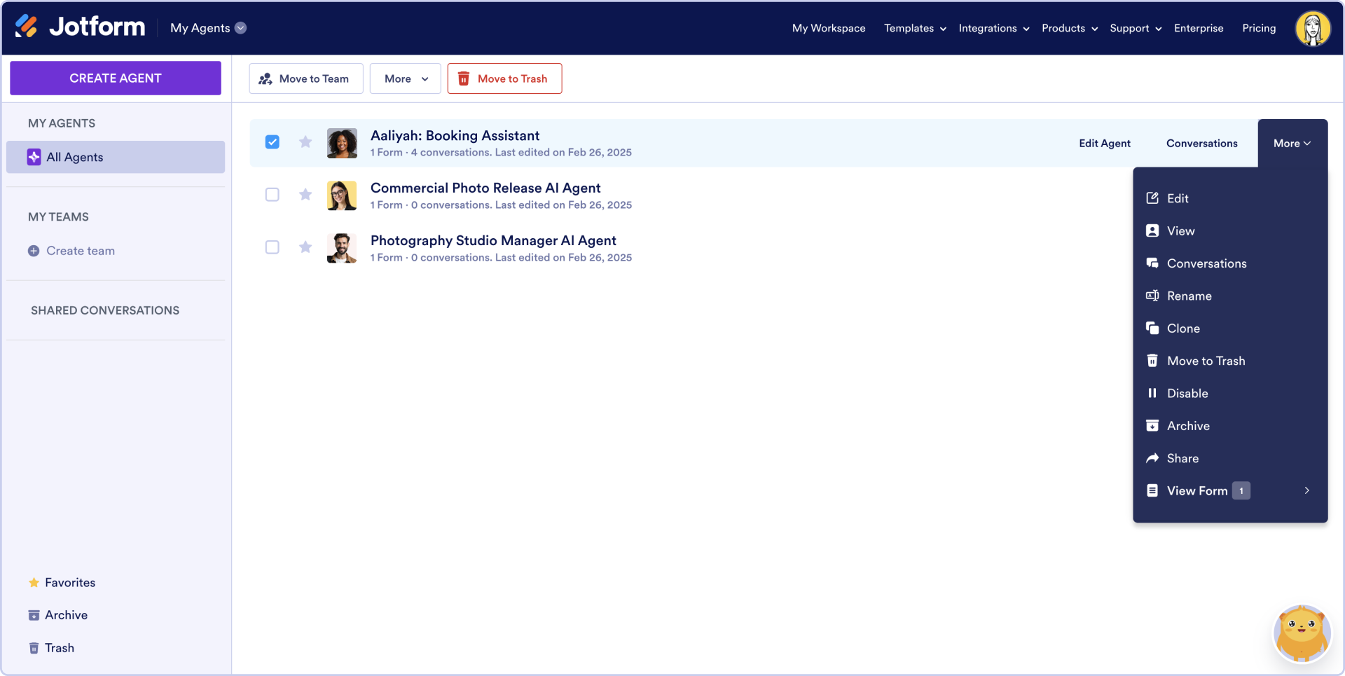 Also, on the mobile Jotform AI Agent app you can view a list of all your agents and their conversations in one place.