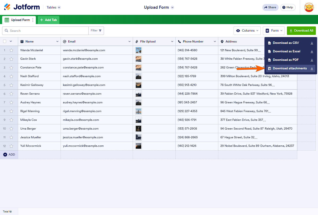 You can download all the files people have uploaded through either Tables or Inbox. If you prefer using Tables, here’s how you can quickly get your files from there: