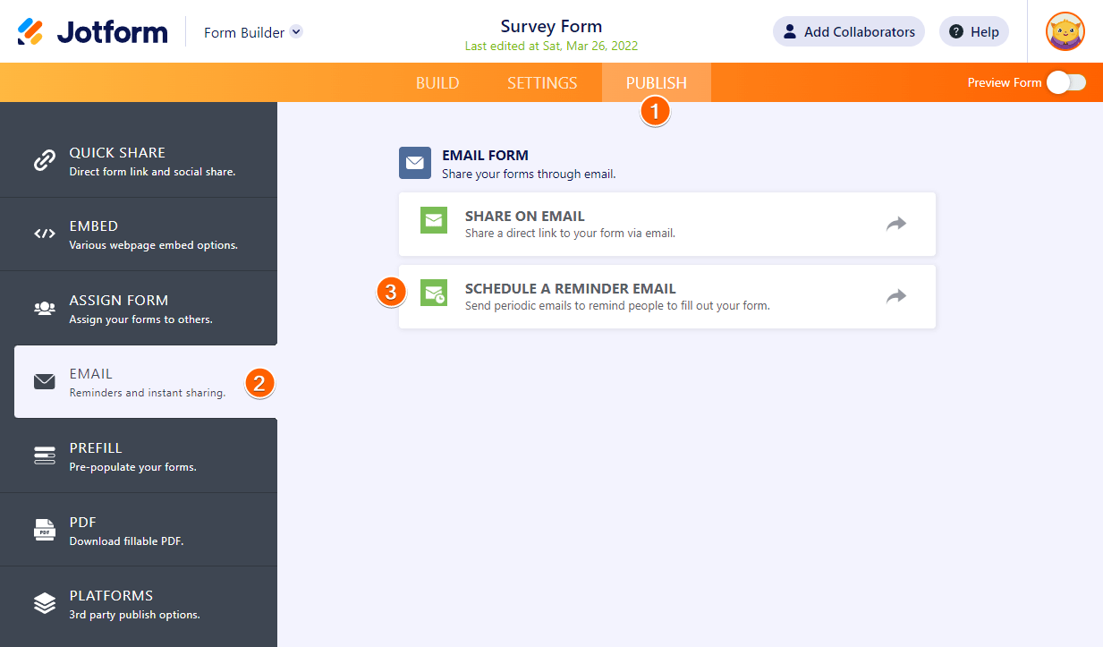 Email pengingat adalah cara bagi Anda untuk membagikan formulir Anda dengan pelanggan dan/atau anggota tim Anda dengan persyaratan tertentu mengenai periode, waktu kedatangan, opsi kalender, dan tanggal akhir atau tanpa akhir.