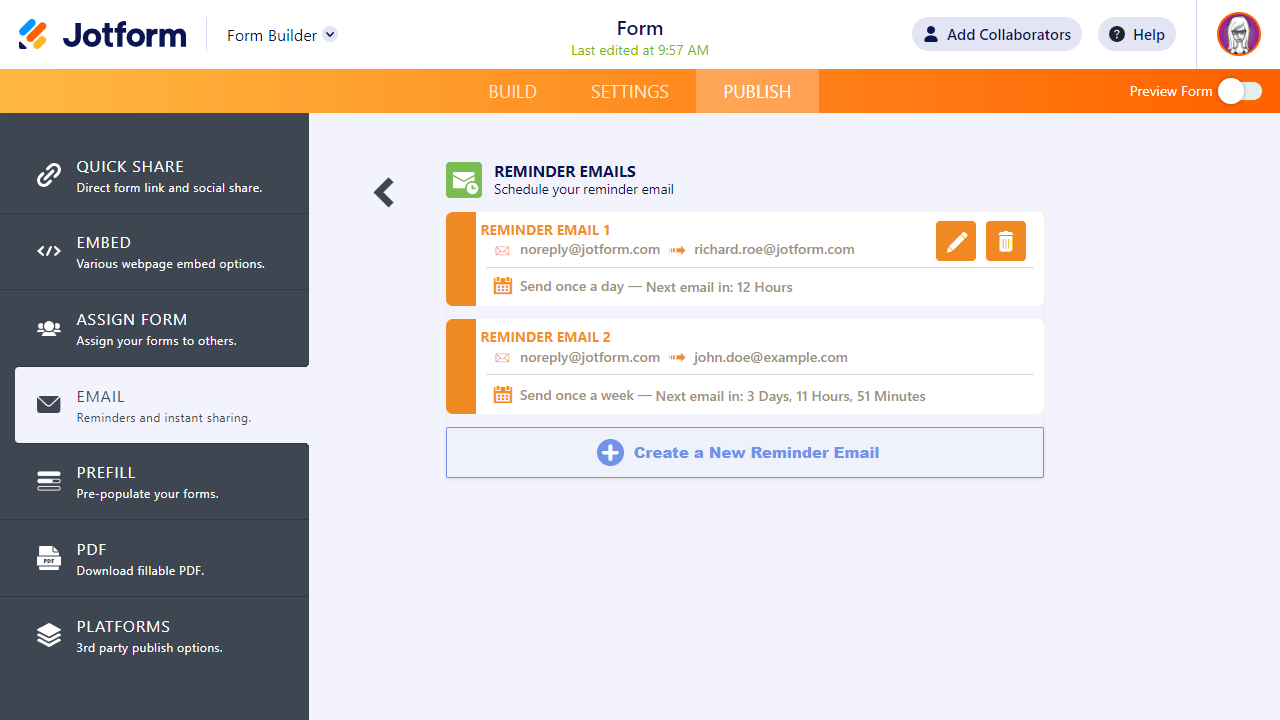 Jika Anda memiliki email pengingat yang disetel untuk formulir Anda. Anda akan disajikan panel yang mencantumkan email pengingat, informasi jadwalnya, dan opsi membuat, mengedit, dan menghapusnya.