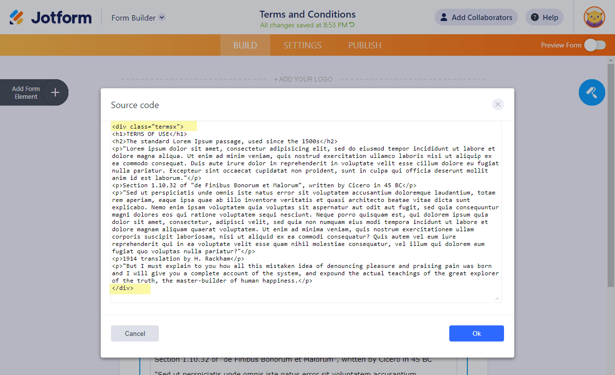 Seringkali, tautan ke “Syarat dan Ketentuan” sudah cukup, tetapi pemilik bisnis yang pemilih ingin menampilkan persyaratan yang sebenarnya pada formulir. Untuk melakukan ini, Anda perlu menerapkan teks yang tidak dapat diedit yang dapat digulir oleh pengguna untuk membaca persyaratan Anda.