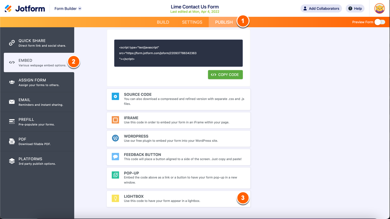 - Ambil kode Jotform Lightbox untuk formulir Anda.