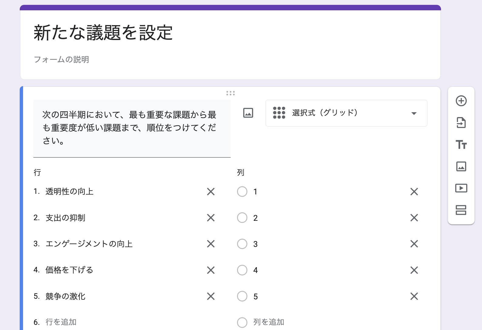 - 順位付けの質問の下に、行と列が表示されます。このフォーマットを使用して、順位付け質問の選択肢を追加しましょう。各行には回答者に順位付けしてもらいたい選択肢を、各列には順位を記入します。例えば、行には「透明性の向上」や「支出の抑制」のような選択肢を追加し、対応する列は、回答者がその選択肢を順位付けるための数字を追加しましょう。(下のスクリーンショットを参照)