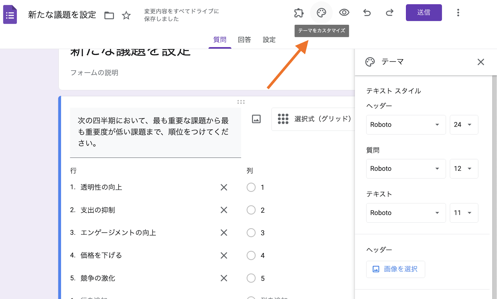 - アンケートの外観をカスタマイズするには、画面上部のペイントパレットアイコンをクリックしてテーマエディタメニューを開きます。Google フォームでは、複数のテーマから選択したり、独自の画像をアップロードしたり、フォームのデザインに変更を加えることが可能です。