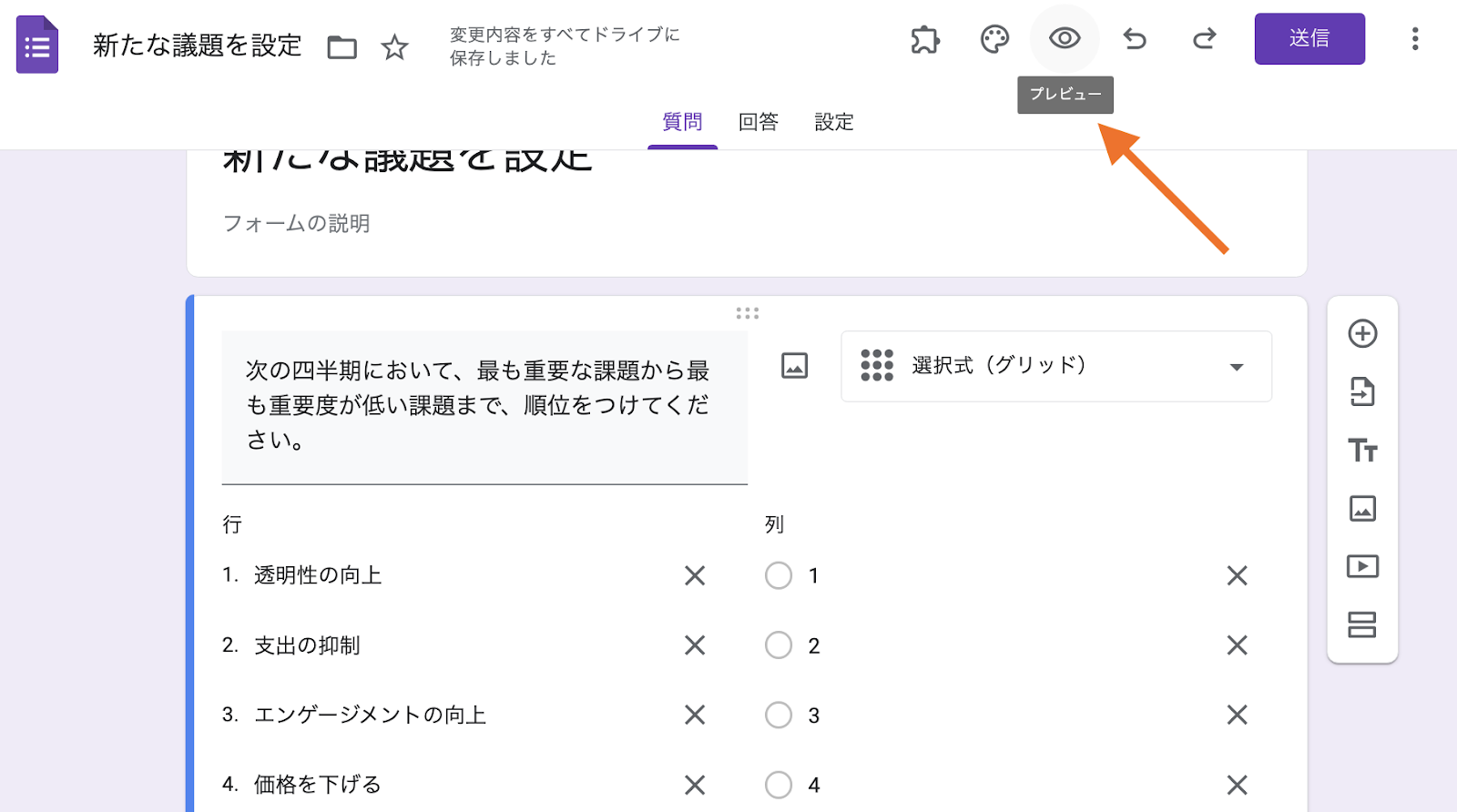- 最後に、リスト項目の上に質問を追加します。フォームのプレビューボタンをクリックして、アンケートの外観を確認しましょう。