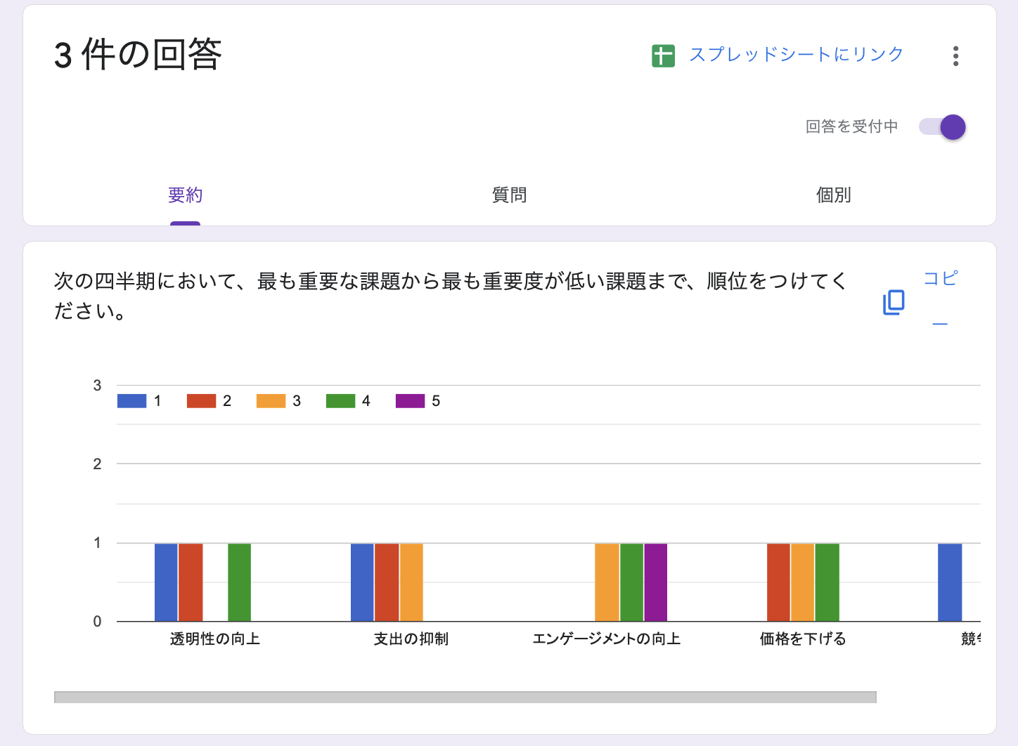Googleフォームの回答の表示方法では、順位付けの質問に対する結果を明確に確認するのが困難です。理想を言えば、Googleフォームがすべてのアンケートの回答を集計し、最も人気のある(または重要な)回答から低い回答へと自動的に順位付けしてくれると結果を把握しやすいでしょう。ですがGoogleフォームでは、データを棒グラフ形式で表示し、各項目が各順位で獲得した票の総数を示しています。