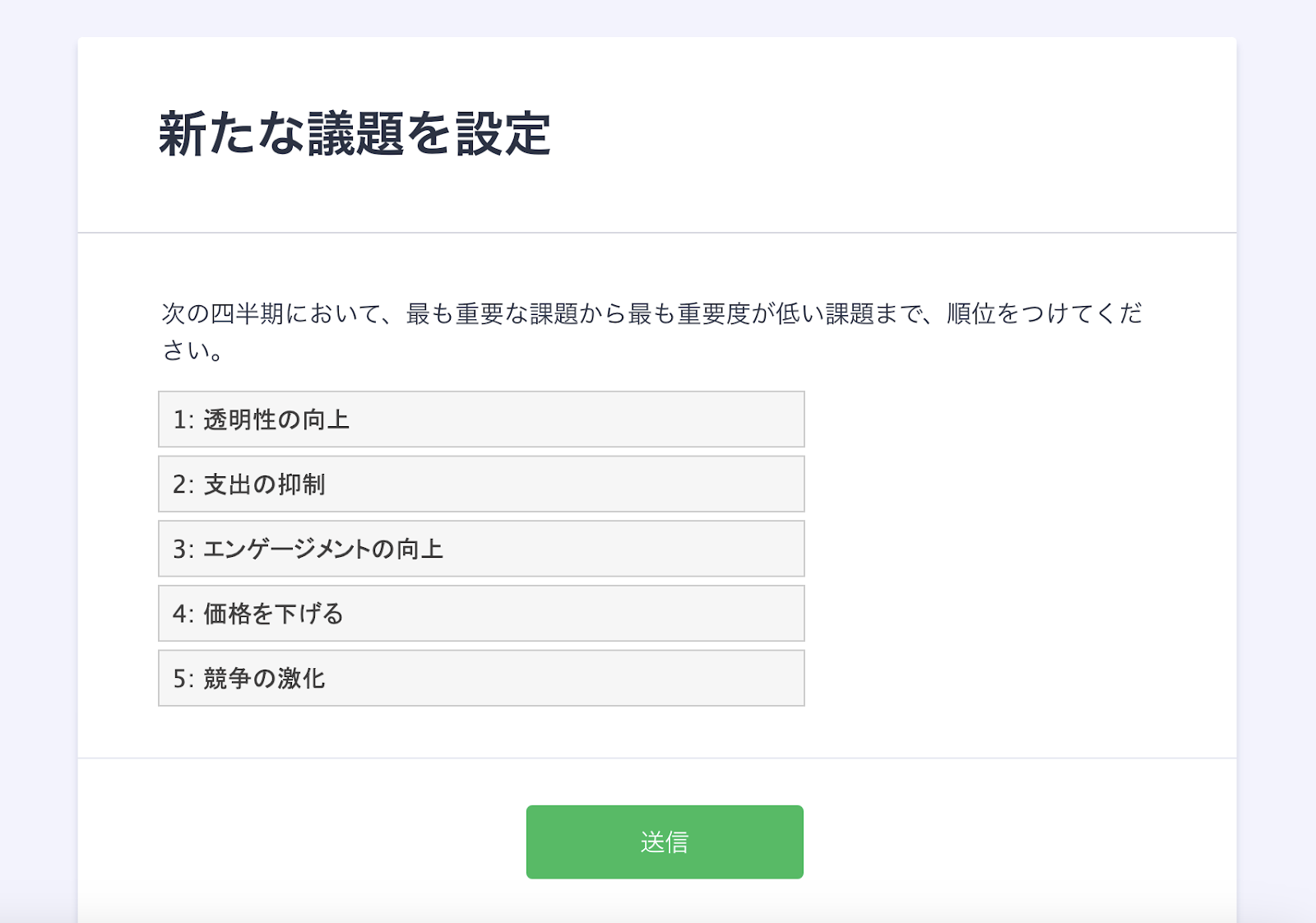 - 質問欄に順位付けの質問を追加します。例えば、次の任期でリーダーが取り組むべき課題についてアンケートを実施する場合、次のように質問しましょう:「次の四半期において、最も重要な課題から最も重要度が低い課題まで、順位をつけてください。」