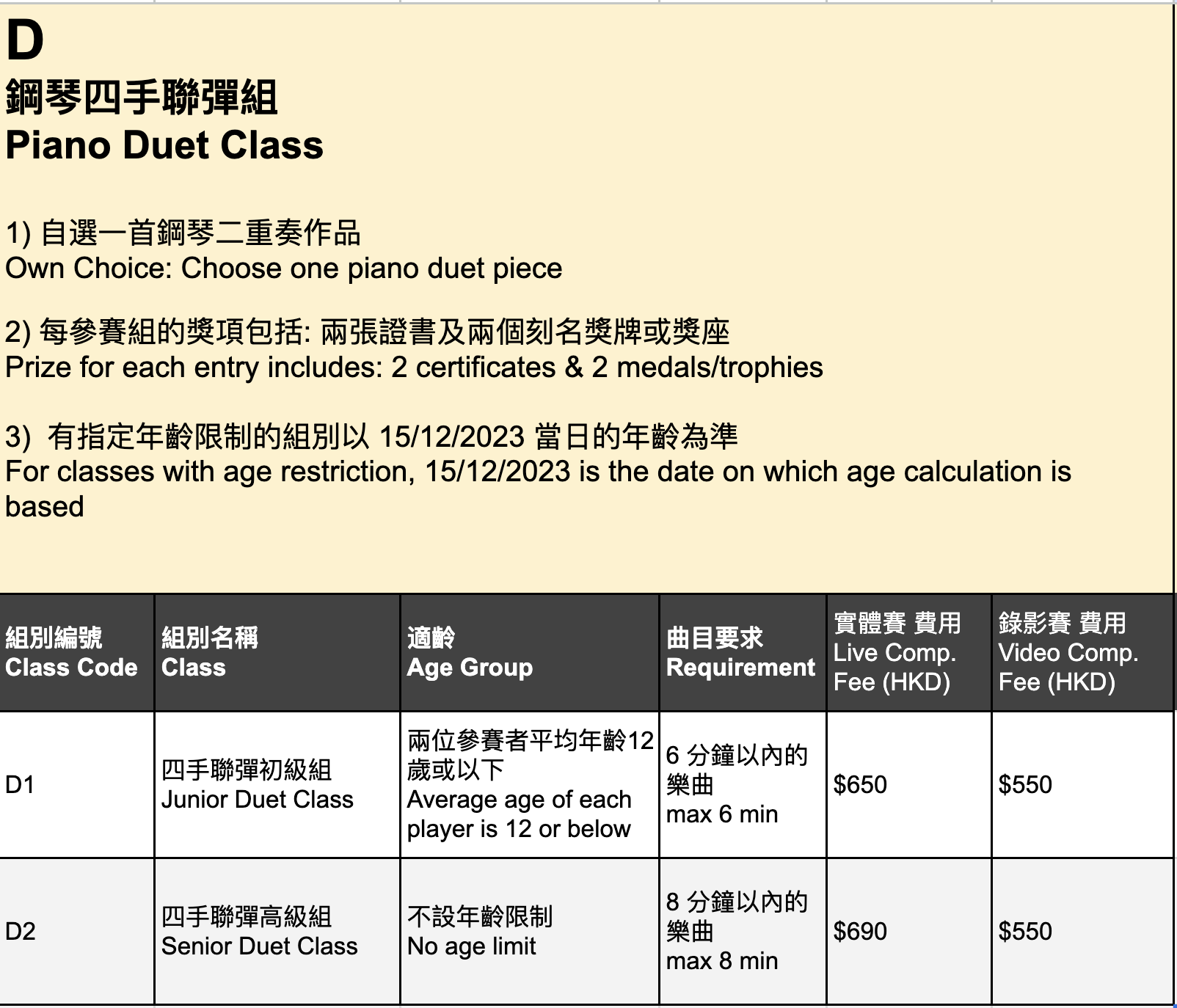 金獎(85分或以上),銀獎(80 - 84分),銅獎(70- 79分) -(可獲發獎牌及證書)