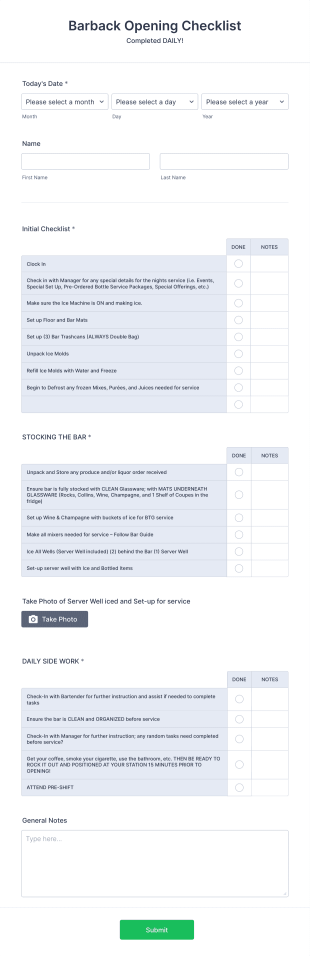 This AI Agent collects critical information such as today's date, staff names, and completion statuses of various tasks. It includes interactive checklists for stocking the bar, ensuring cleanliness, and taking photos of setup. The AI Agent can also gather general notes from staff to facilitate communication and improve workflow. These features allow bar staff to efficiently manage their responsibilities and ensure a well-prepared environment for customers.