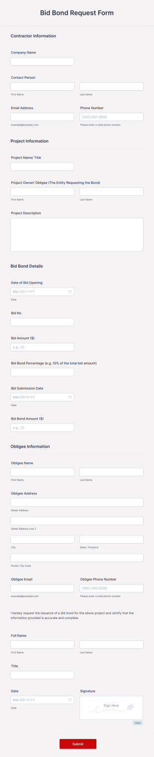The Bid Bond Request AI Agent is an interactive assistant tailored to simplify the collection of essential information required for bid bond requests. This AI Agent engages users in a conversational format, ensuring that vital details such as company information, project specifics, and contact details are gathered accurately and effortlessly. By utilizing Jotform’s AI Agents, businesses can enhance user engagement while streamlining operations, making the bid bond request process more efficient.