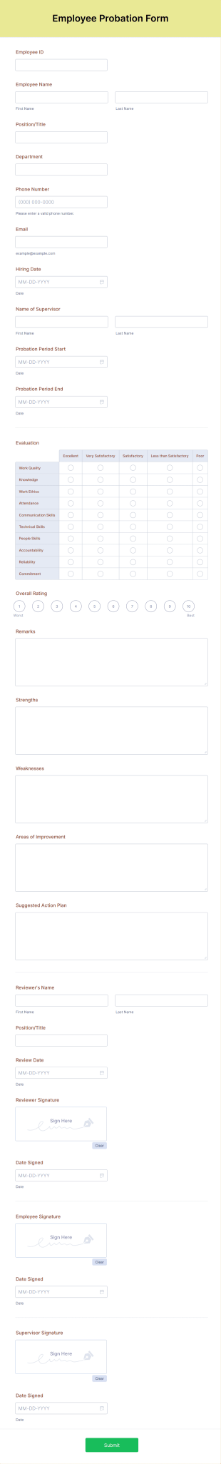 This AI Agent collects a wide range of data, including employee ID, name, position, department, and various performance metrics. It enables organizations to gather evaluations, overall ratings, remarks, and suggested action plans from supervisors. The integration of conditional logic allows for personalized conversations based on employee responses, enhancing the overall experience. Additionally, the agent can be customized to reflect the organization's branding, ensuring a cohesive onboarding process.