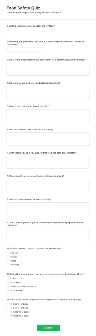 The Food Safety Quiz AI Agent is crafted to help individuals and organizations assess their understanding of food safety principles. It serves as a valuable educational tool, allowing users to learn about critical practices such as proper food storage, handling techniques, and hygiene standards. This template not only raises awareness but also helps organizations identify knowledge gaps, ensuring that staff are equipped with the necessary information to maintain a safe kitchen environment.