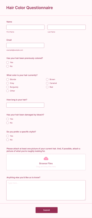 The Hair Color Questionnaire AI Agent is an interactive assistant designed to guide clients through a detailed hair color assessment. This AI-powered assistant collects vital information about hair history, current color, and preferences, simplifying the consultation process for salons. By gathering essential details, it ensures a unique and tailored experience for each client, enhancing satisfaction and engagement.
