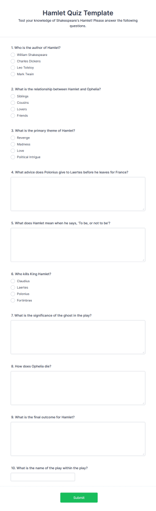 This AI Agent collects a wide range of responses, including multiple-choice answers and open-ended questions related to Hamlet. By utilizing its conversational capabilities, it can guide participants through questions such as identifying the author of the play, exploring character relationships, and discussing key themes. The customization options allow educators to tailor the agent’s appearance and functionality, ensuring it aligns with their specific needs.