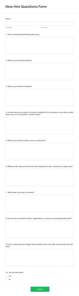 The New Hire Questions AI Agent collects a wide range of data, including names, interesting facts, favorite pastimes, and preferred methods of recognition. It can also inquire about new hires' favorite snacks, important traits they value in coworkers, and their relaxation techniques. This comprehensive data collection allows organizations to tailor the onboarding experience and build a supportive workplace culture. With customizable conversation interfaces, businesses can ensure that the agent aligns with their brand and values.