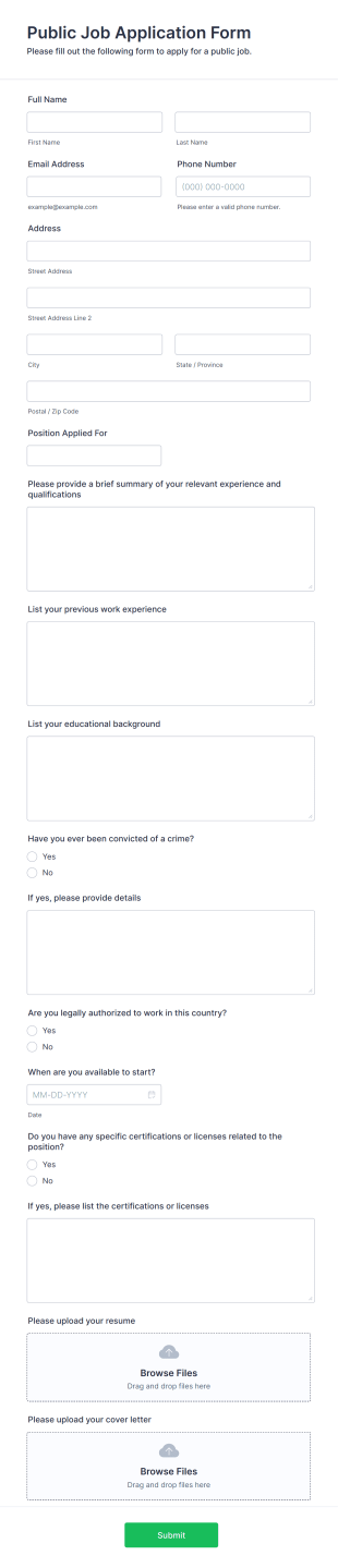 The Public Job Application AI Agent is an interactive assistant designed to streamline the job application process for candidates seeking public employment. This AI Agent engages applicants in a dynamic conversation, collecting essential information such as personal details, work experience, and qualifications, ensuring a smooth and efficient application experience. With Jotform’s AI Agents, organizations can create user-friendly application processes that enhance conversational data collection, making it easier for both applicants and employers to manage job applications effectively.