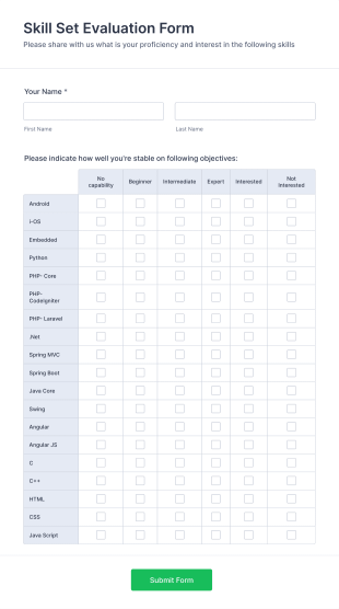 This AI Agent allows organizations to collect a wide range of data, including individual names and proficiency levels across multiple skills such as programming languages and frameworks. The conversational interface encourages participants to share their self-assessments and interests in various competencies. With customizable features, organizations can tailor the agent’s appearance and responses to align with their branding and evaluation criteria, enhancing the overall user experience.