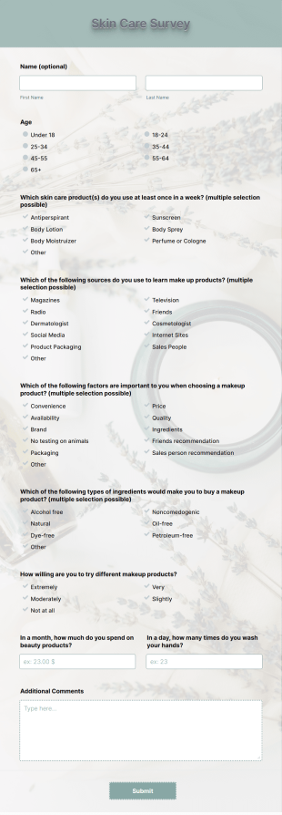 The Skin Care Survey AI Agent is an engaging conversational assistant designed to help businesses collect vital information about their customers' skin care preferences and needs. By simplifying the survey process, this AI Agent enables businesses to gather valuable insights that can enhance their product offerings and significantly boost customer satisfaction. Jotform’s AI Agents transform traditional forms into dynamic conversations, providing customizable and interactive experiences that foster deeper customer engagement.