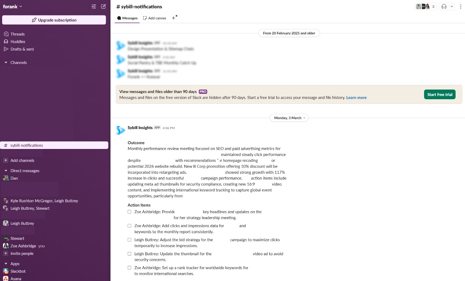 My cofounder introduced me to Sybill. Now, I can’t live without the meeting notetaker or the to-do list that it automatically creates and sends as a message into my company’s Slack after every meeting. The following image shows how Sybill sends notifications to Slack.