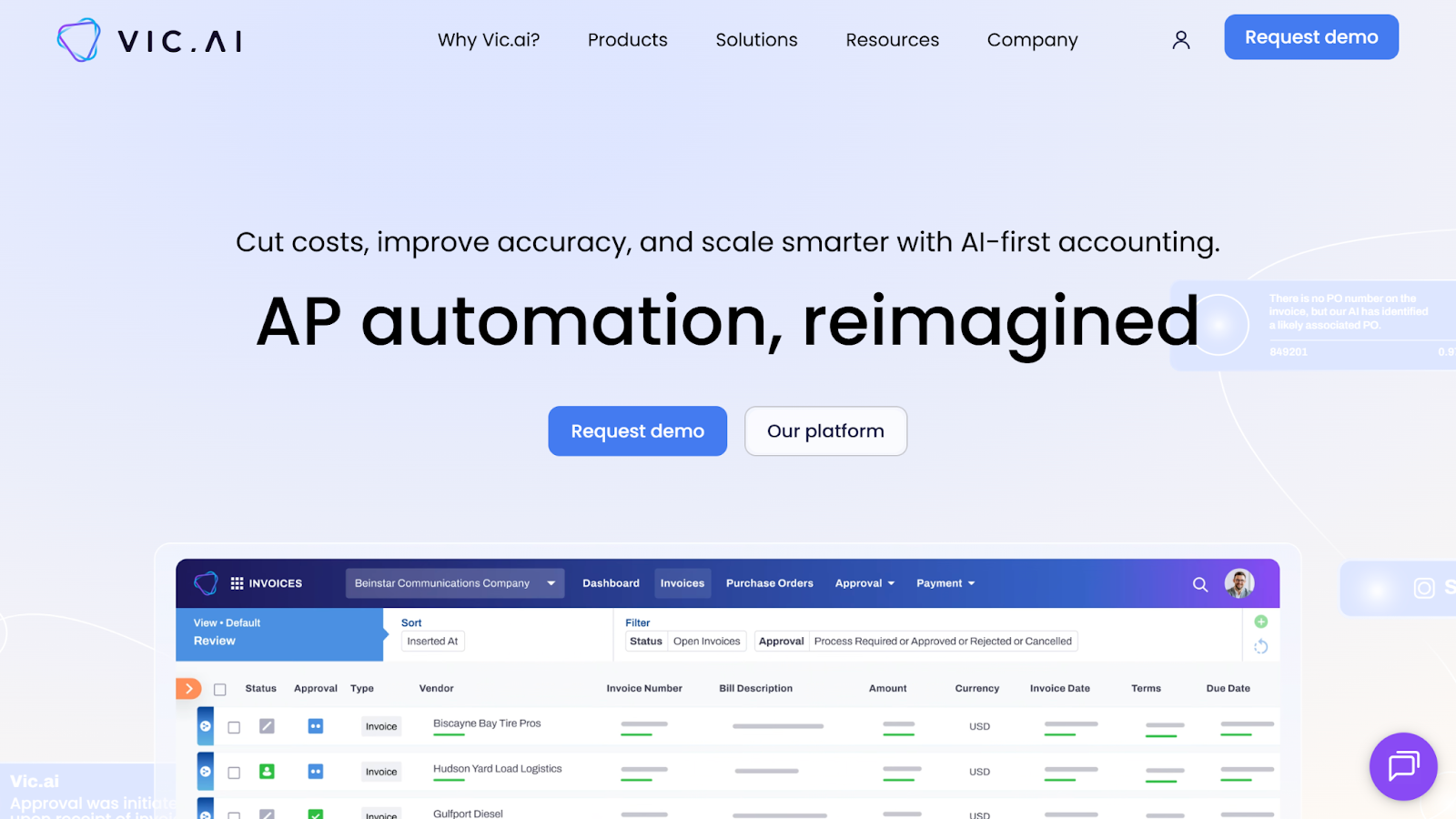 Focused on automating accounts payable processes, Vic.ai is an AI-first accounting software. Vic.ai is designed to streamline tasks like invoice processing, bill payments, purchase order (PO) matching, and approval workflows. Beyond this, Vic.ai offers tools such as expense management, analytics, AI agents, and an autonomous finance platform.
