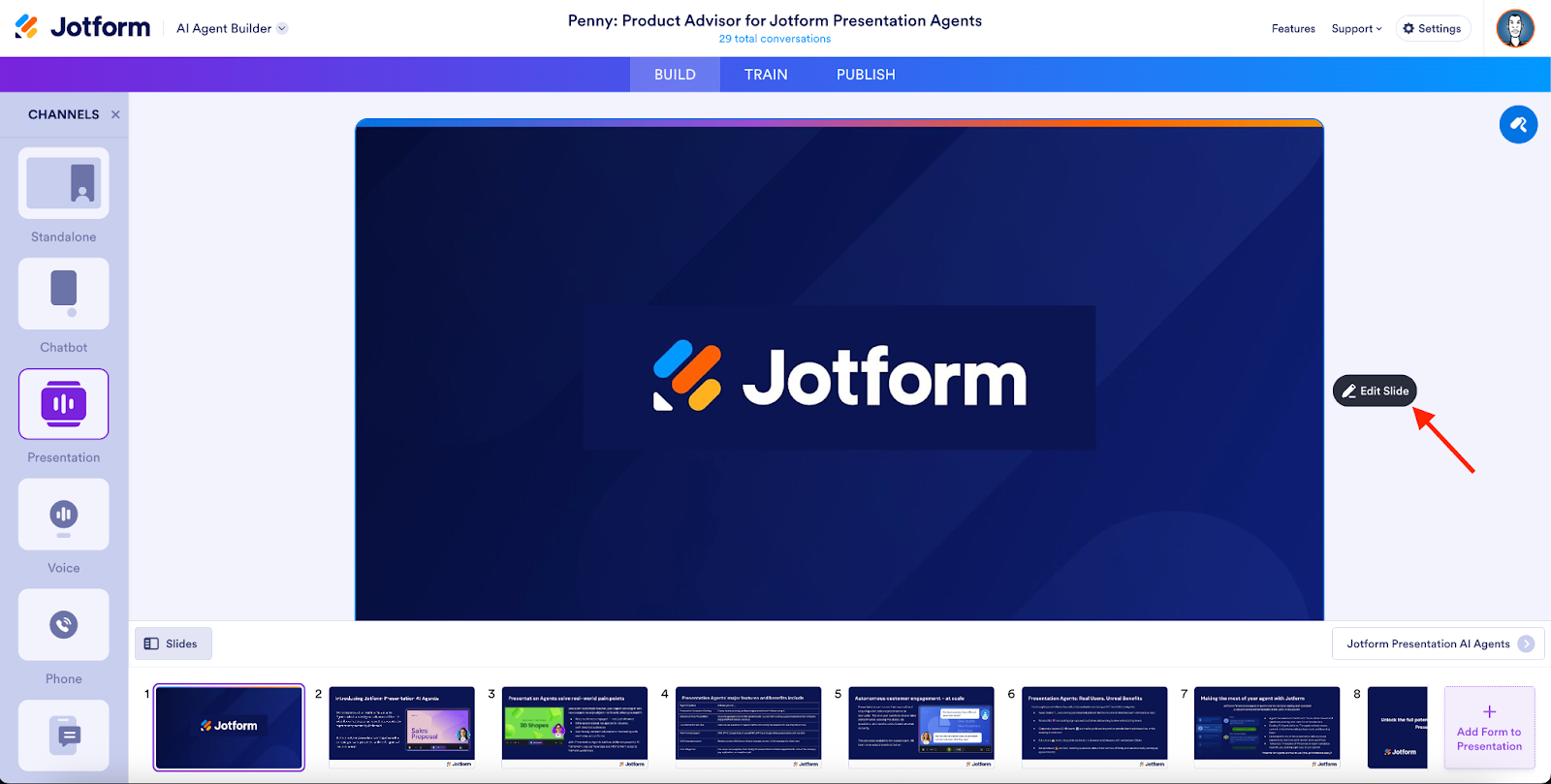 You can also access the slide editing interface by opening the Build page of the AI Agent Builder and selecting Presentation from the sidebar.