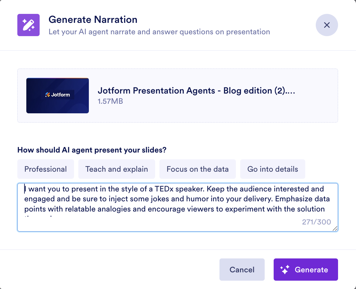 The entire process takes only seconds. After the upload is complete, a Generate Narration modal will appear. You’ll see a few presentation delivery style options, as well as a field in which you can enter additional notes.