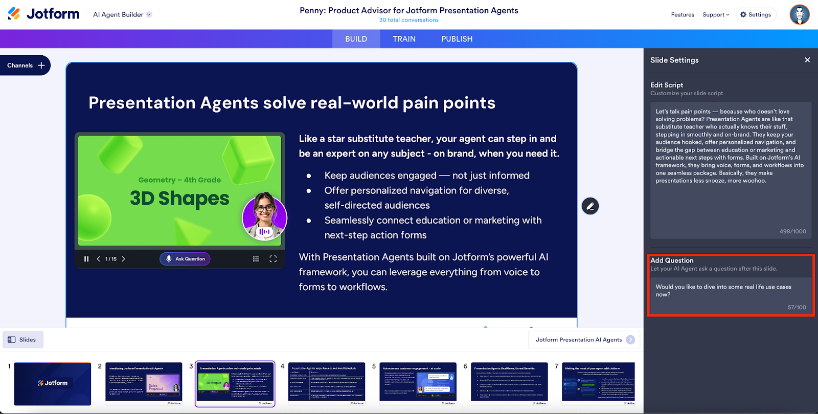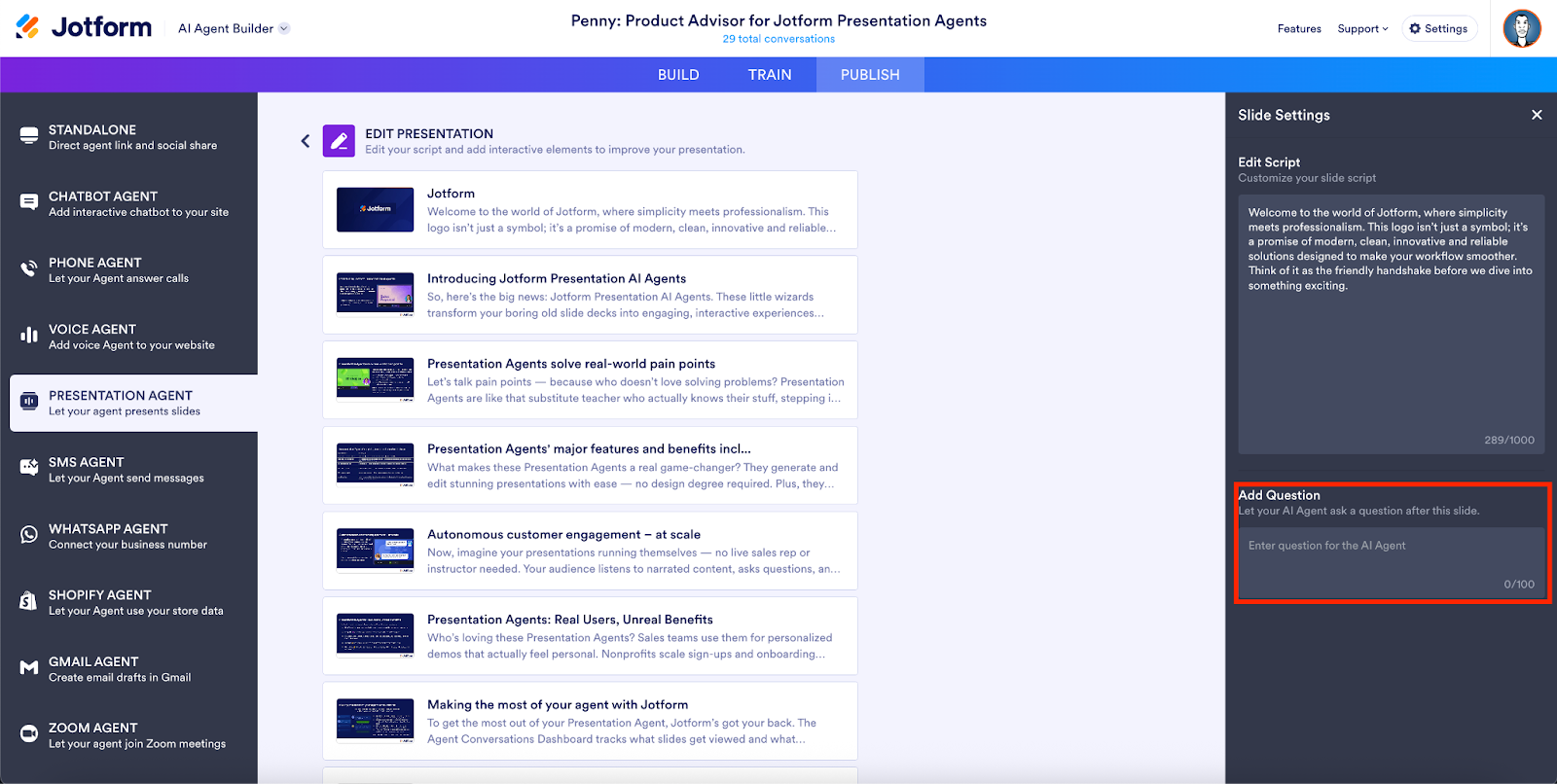 The Scripts tab in Slide Settings also lets you add a custom question to a slide. Simply enter a question in the Add Question field, and your agent will ask the question at the end of the slide.