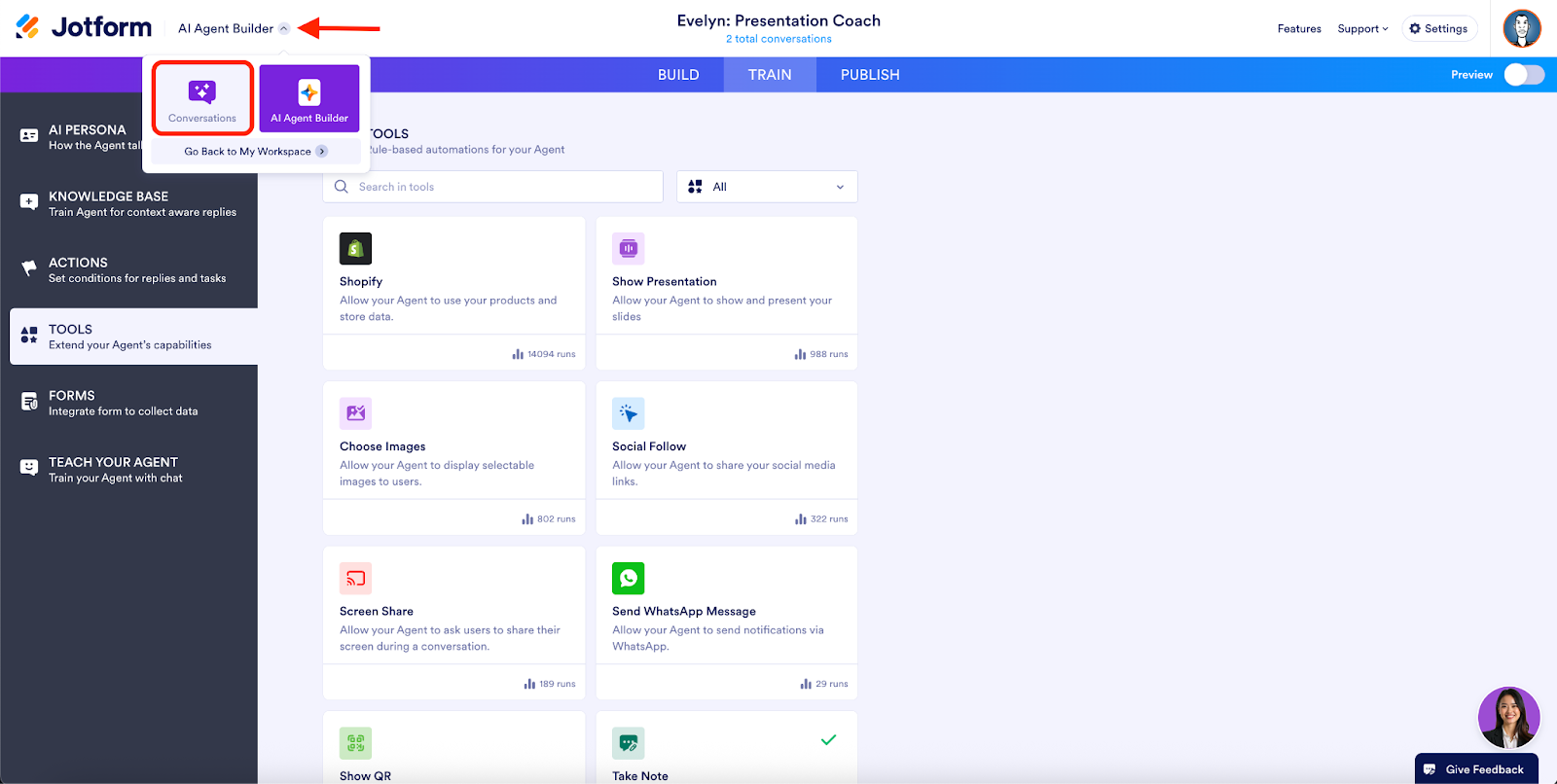 If you’ve already built an AI Agent, perhaps a chatbot, and you want to give that agent the ability to show a presentation in addition to its primary duties, you can use this feature. In the AI Agent Builder, select Train from the toolbar, choose Tools from the sidebar, then click Show Presentation.
