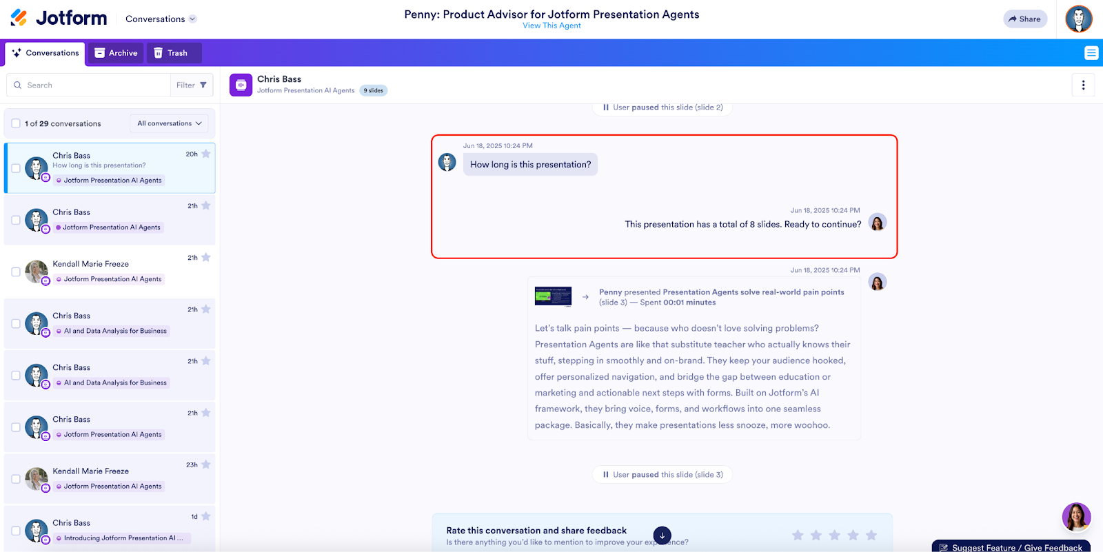 The Conversations interface shows you all the user conversations your agent has had. You can review user questions and agent answers. Having this data available can provide you with actionable insights into viewer engagement and give an idea of the effectiveness of your content, helping you fine-tune the presentations you create!