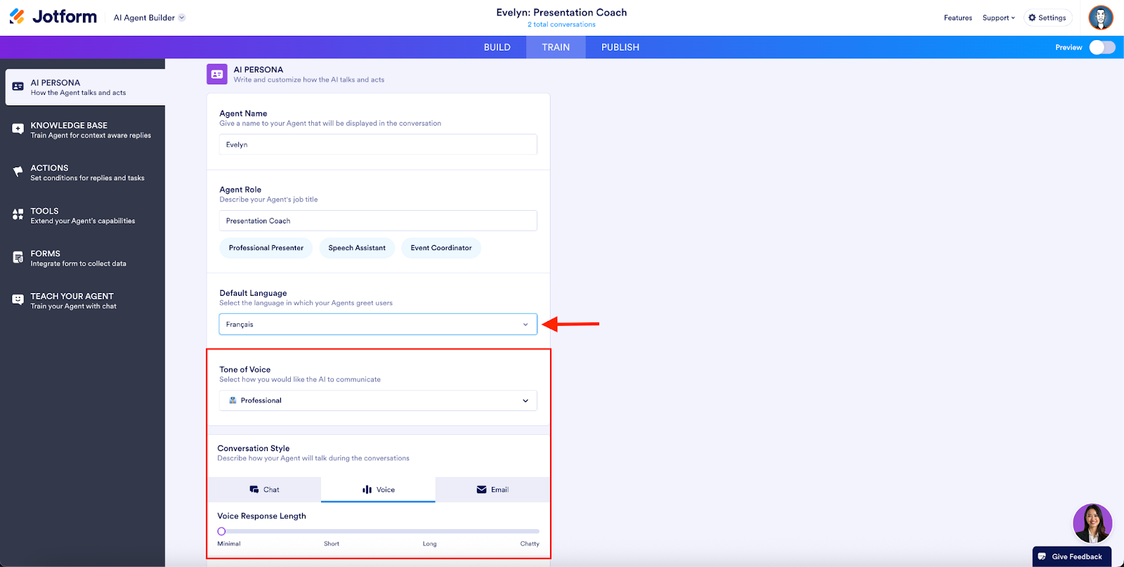 Presentation Agents can present in multiple languages. To set the agent’s default language, open it in the AI Agent Builder and select Train in the toolbar. Select AI Persona from the sidebar. In the AI Persona window, use the Default Language dropdown to choose your agent’s primary language.