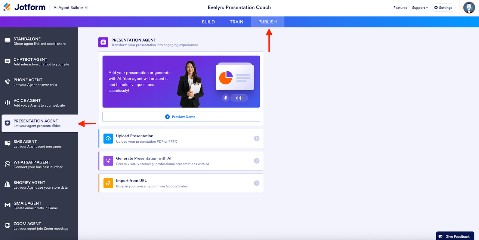 Select Publish from the toolbar to open the Publish page, then select Presentation Agent from the sidebar.