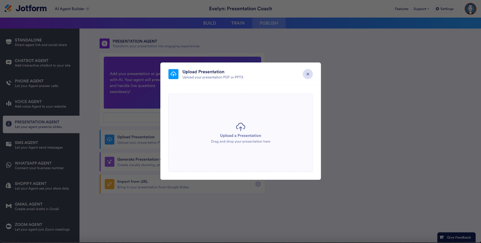 Just drag and drop an existing PDF or PowerPoint file into the AI Agent Builder to upload your presentation to Jotform.