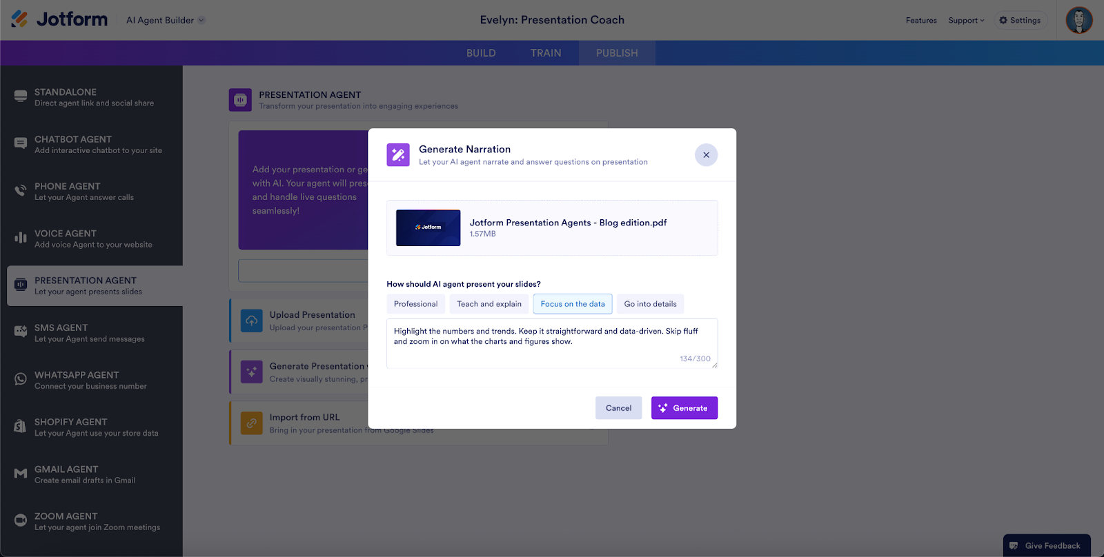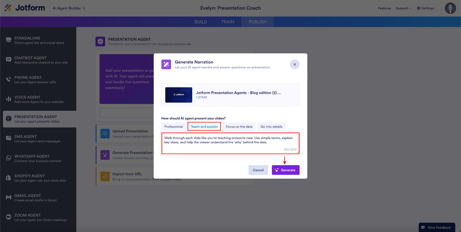 After importing your deck, choose the presentation delivery style and enter any additional notes in the text field. Click Generate to add the presentation to your agent.