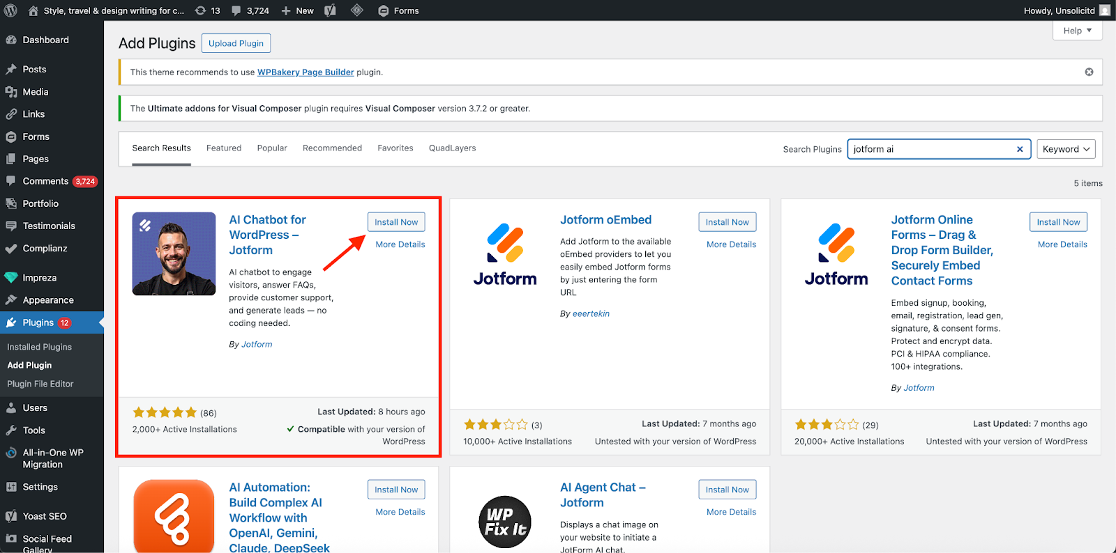 Select the plugin called AI Chatbot for WordPress – Jotform, then click Install Now. After it’s installed, click Activate. Once activated, you’ll see Jotform AI Chatbot listed among your installed plugins.