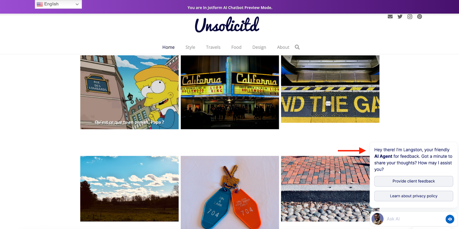 Click Preview to preview what your chatbot will look like on your website. In my case, you can see the agent appears on my homepage (and every other page of the site) . . .