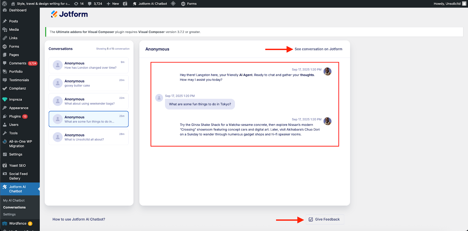 In the sidebar of your WordPress dashboard, click Conversations beneath the plugin.