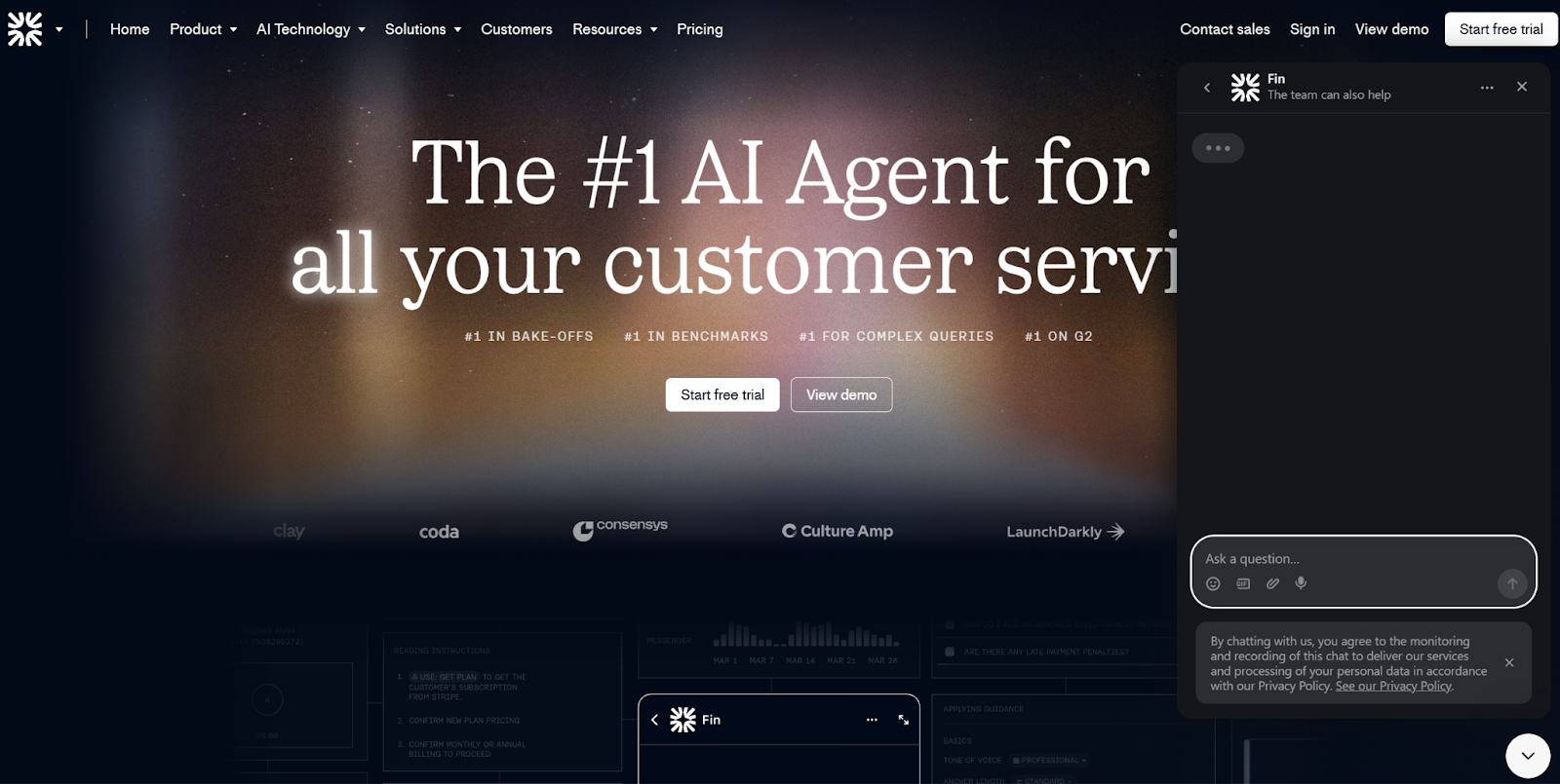 Intercom is a leading customer communications platform. It’s enhanced with its AI assistant, Fin, which brings advanced automation into the mix. Fin uses AI to deliver instant, accurate answers from a company’s help center, reducing ticket volume while keeping conversations personal. It’s best suited for businesses already using Intercom that want to add AI-powered support without switching platforms.