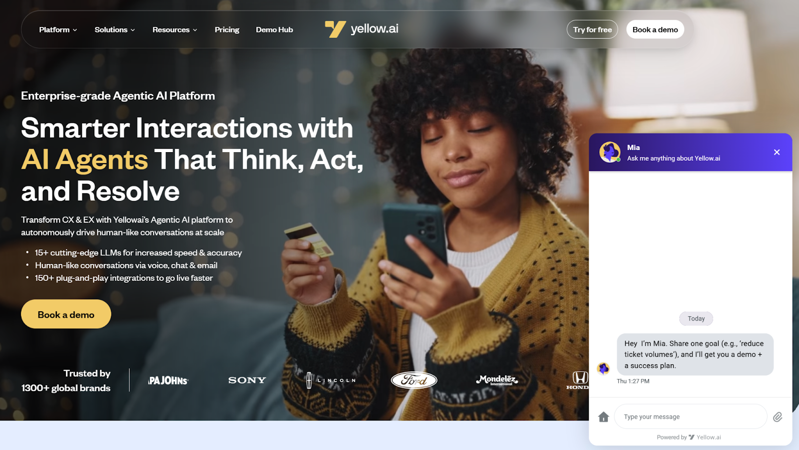 Yellow.ai is an enterprise-grade conversational AI platform that delivers customer and employee experiences across voice, chat, and messaging channels. It’s best suited for large organizations that need to serve global audiences with consistent, intelligent support.