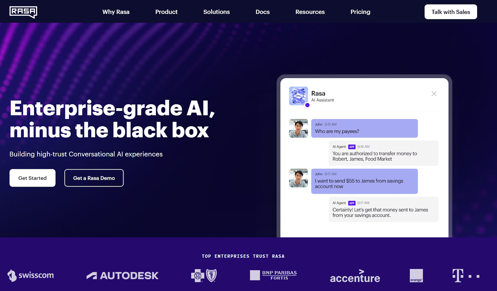 Rasa is an open-source conversational AI framework that gives developers complete flexibility to build and deploy chatbots tailored to their exact needs. It provides full transparency, no vendor lock-in, and advanced customization options. It’s best suited for enterprises and technical teams that need robust, scalable conversational AI solutions.