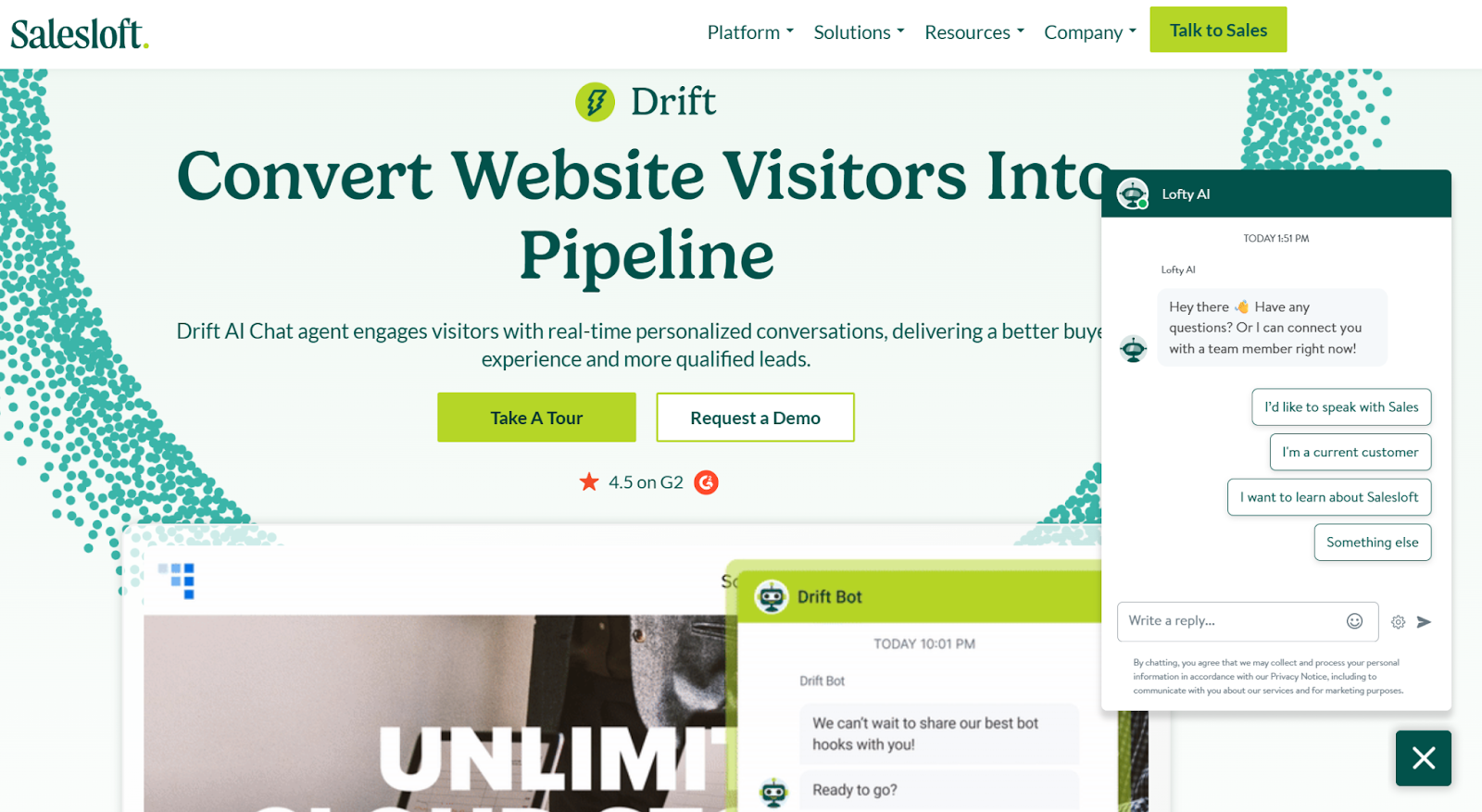 Drift is a conversational marketing and sales platform that uses AI chatbots to engage website visitors, qualify leads, and book meetings. Part of Salesloft, it focuses on revenue-driven conversations, making it a favorite for sales and marketing teams. It’s best suited for B2B companies that want to accelerate their pipeline by connecting prospects to the right reps faster.