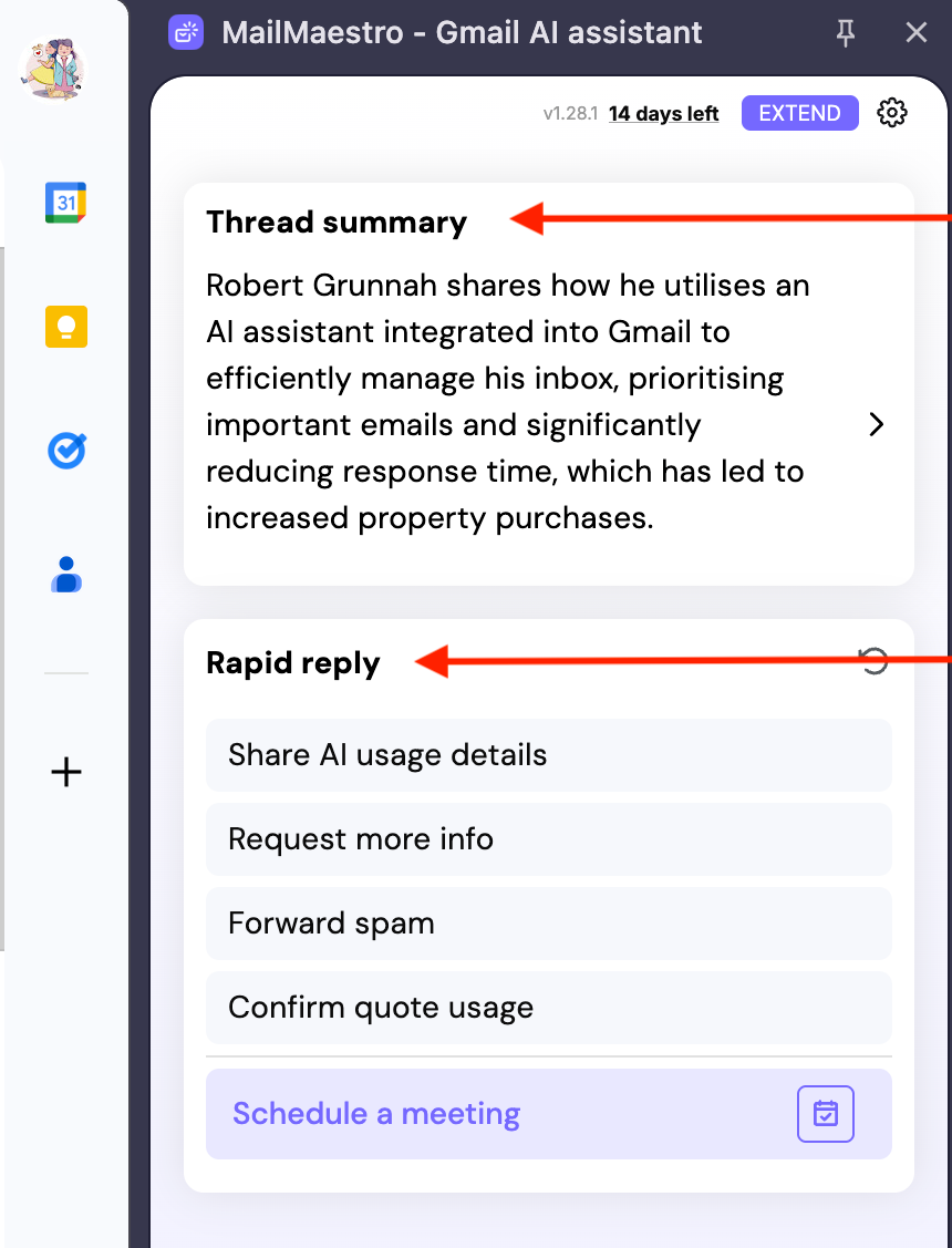 When you pick any email thread, GPT instantly summarizes the conversation and provides smart reply suggestions. From there, you can tweak your response by rewriting it, improving it, fixing grammar and spelling, or shifting the tone.