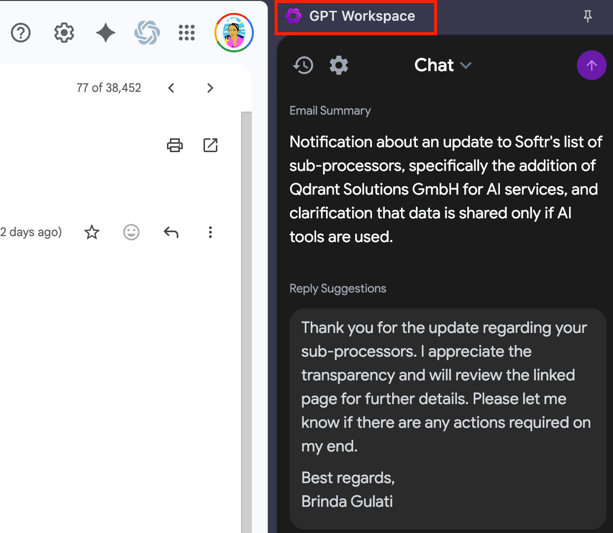- Integrated GPT Workspace: Access advanced AI writing and editing tools directly in Gmail.