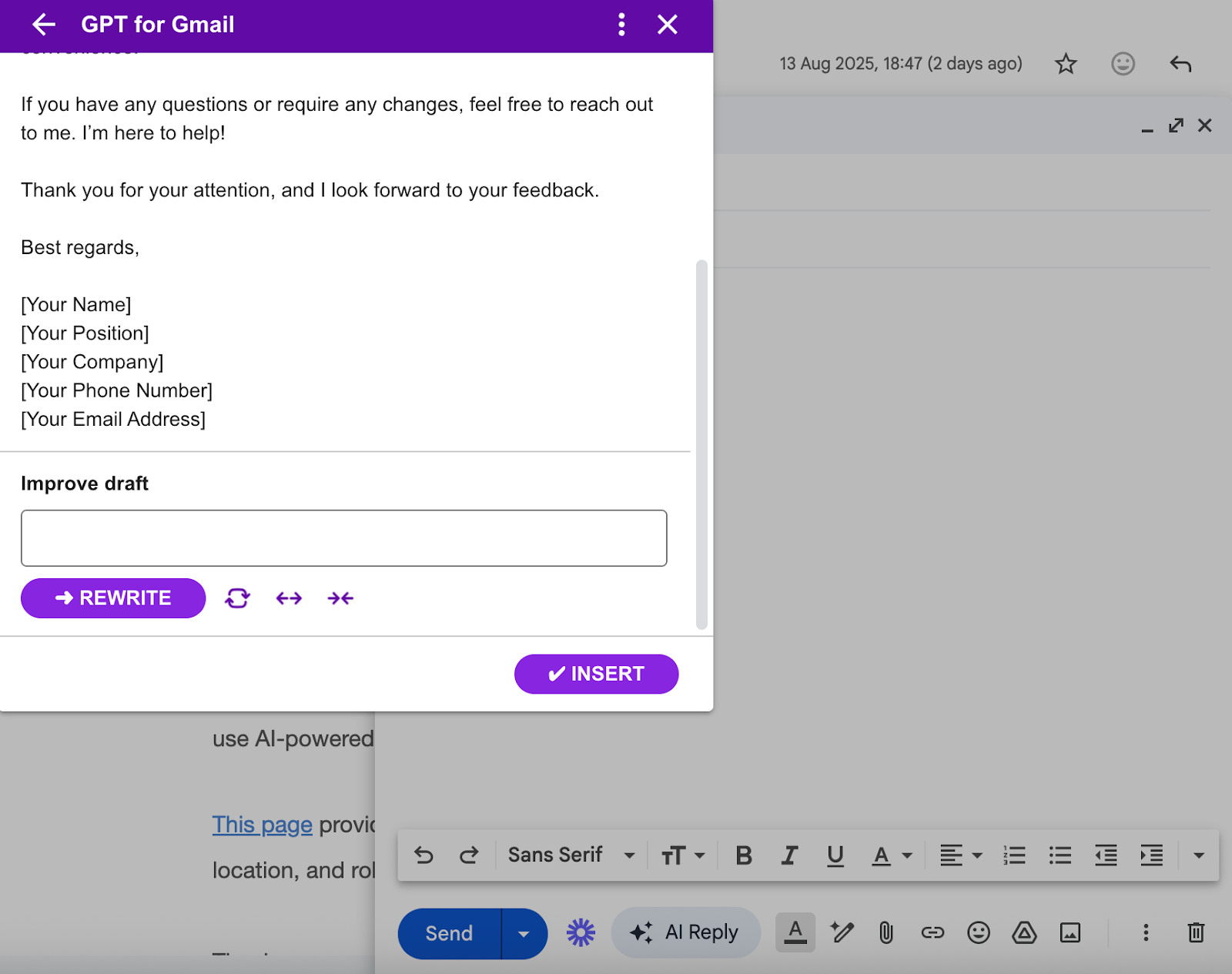 GPT then generates a full email, complete with templates and placeholders. You can shorten it, rewrite it, or polish it, then insert it straight into your draft with one click.