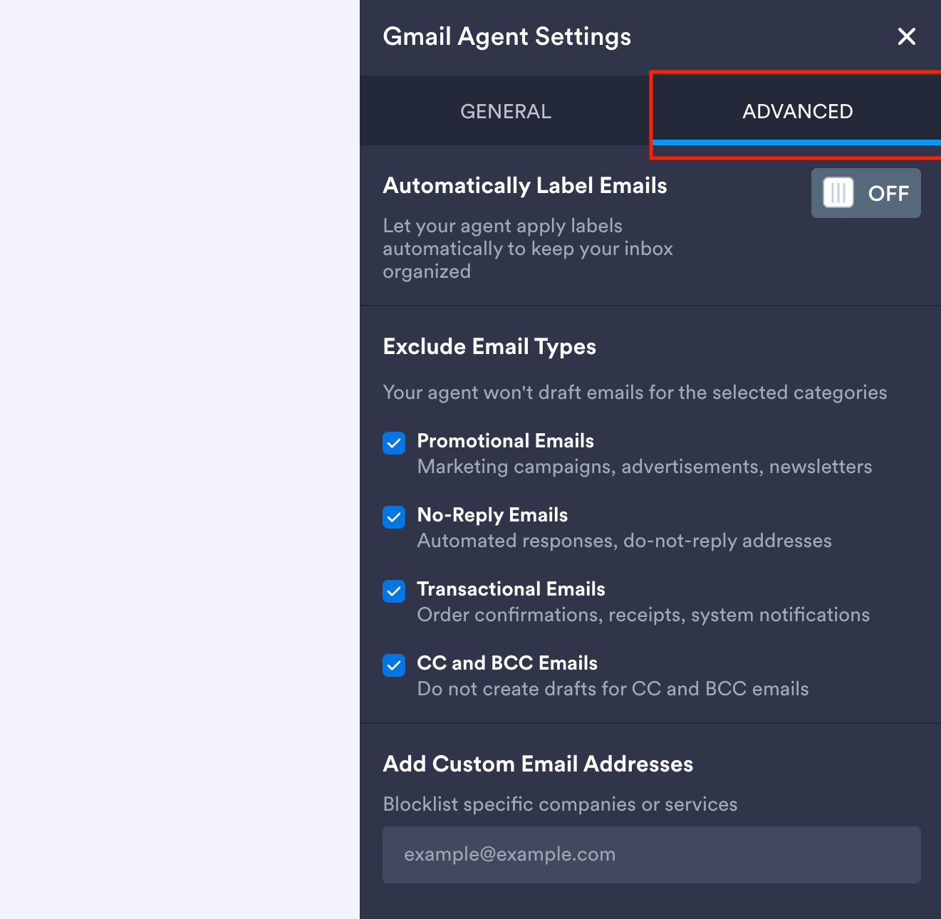 - Exclude noisy stuff from drafting: promotions, noreply addresses, transactional alerts, CC/BCC threads — even specific senders you never want the AI agent to touch.