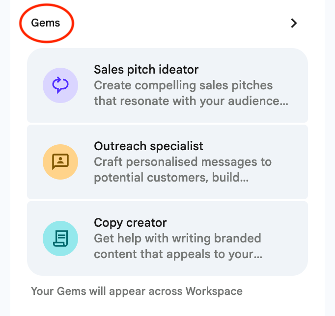 When I open Gemini, there’s a “Gems” panel. These are like ready-made mini-assistants, including a sales pitch ideator, outreach specialist, and copy creator.