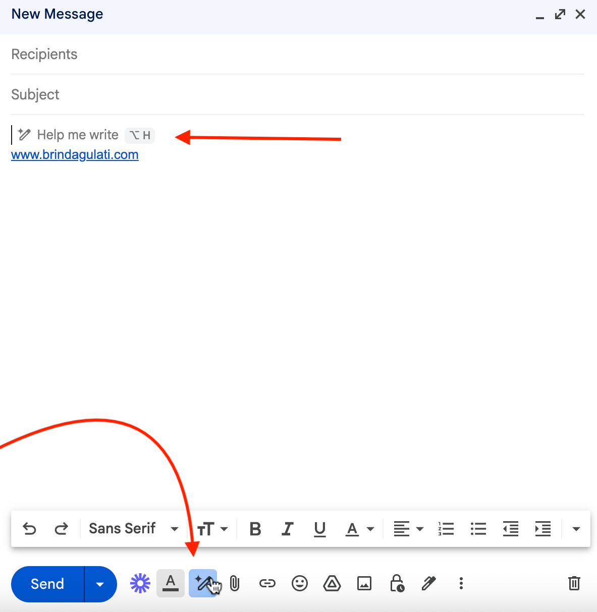 Help Me Write is Google’s AI-powered email drafting tool built directly into Gmail. I can open it two ways: by clicking the pencil-star icon in the Gmail compose toolbar, or by using the Mac shortcut (⌥ + H).