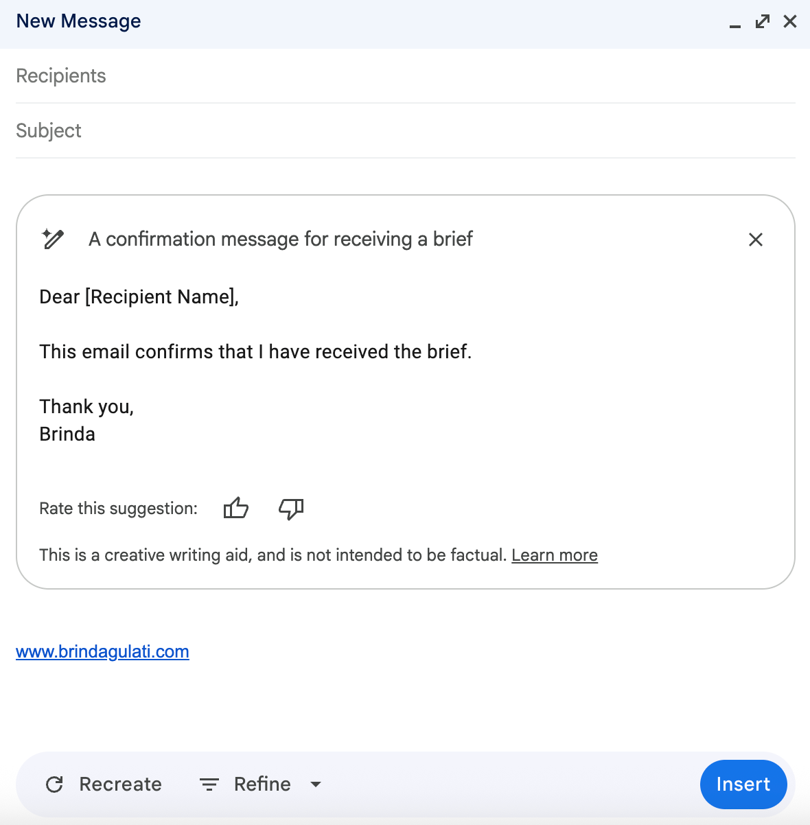 I type a quick prompt (“follow up on yesterday’s meeting,” “formal thank-you,” “confirm receiving a brief”) and the AI generates a complete draft in seconds.