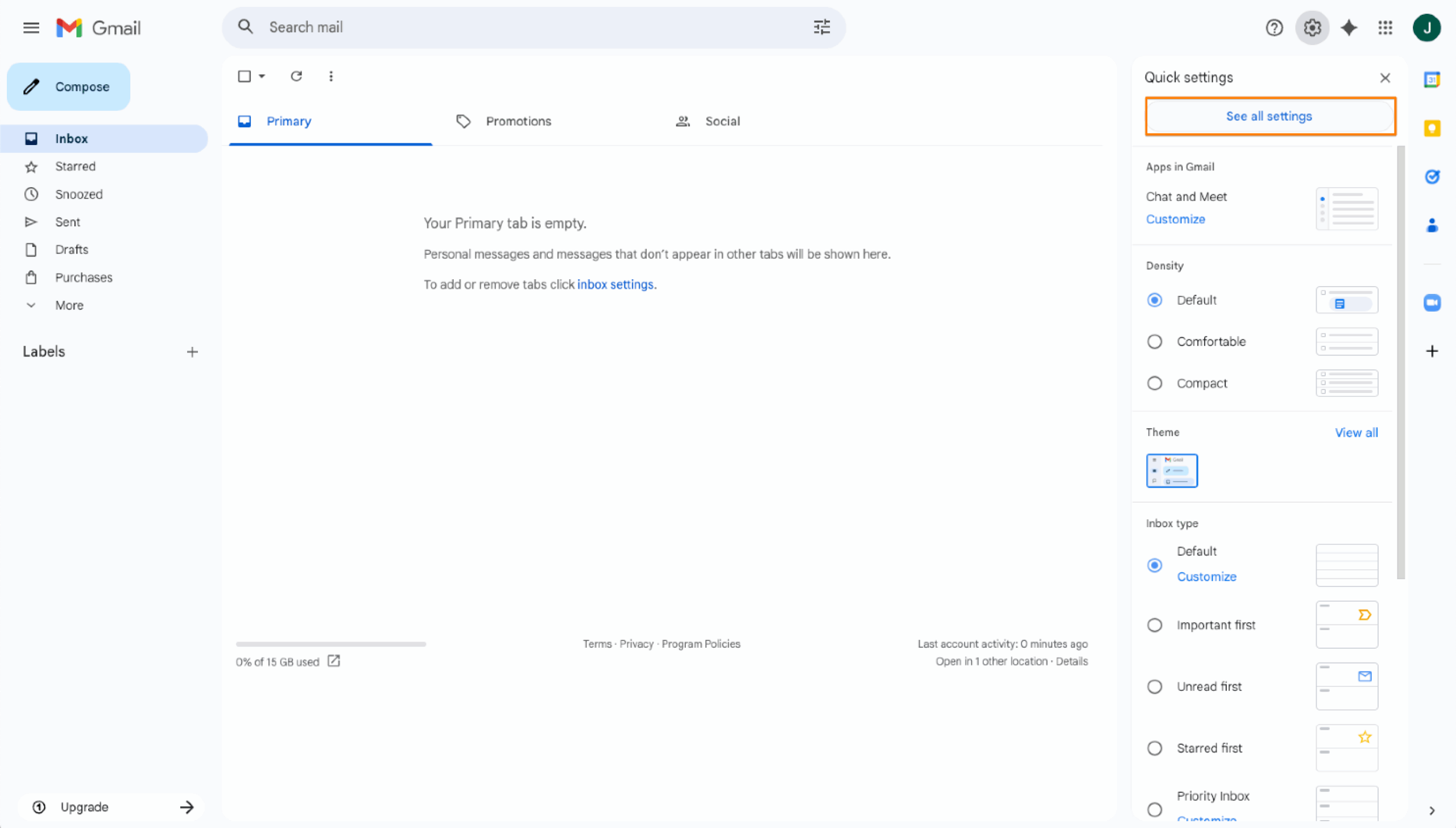 Once you’re logged into your Gmail inbox in your browser, follow these steps to stop Gmail predictive text and turn off suggestions: