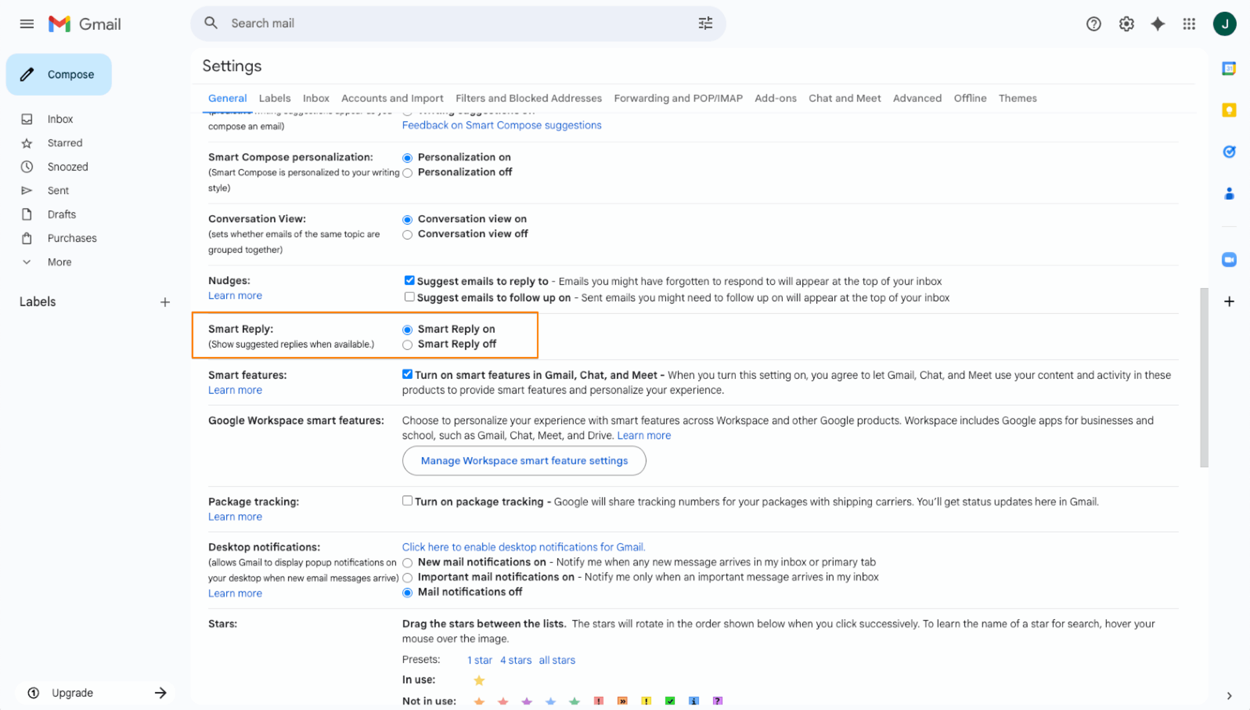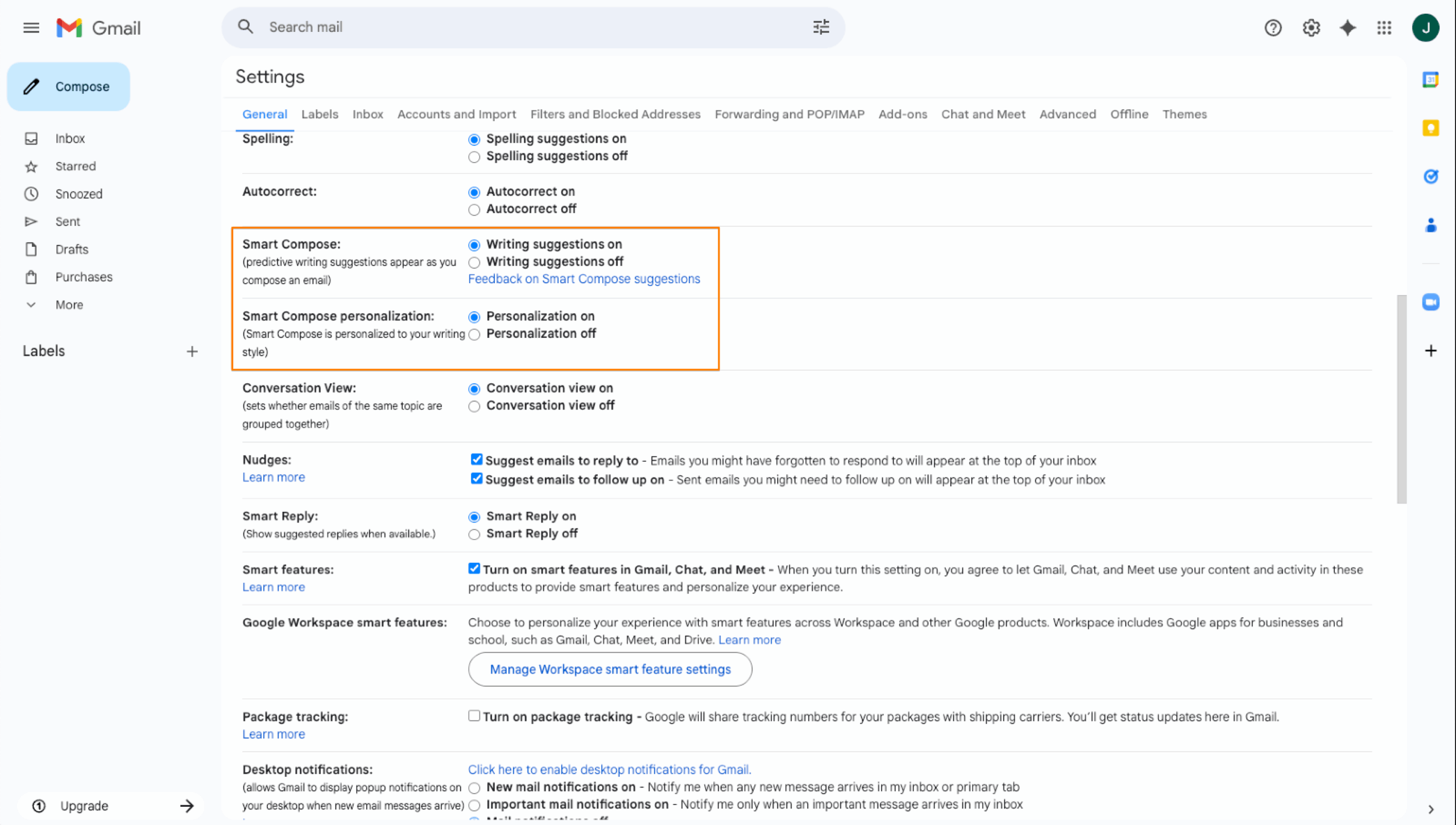 - Click on the General tab, and scroll down to the Smart Compose section.