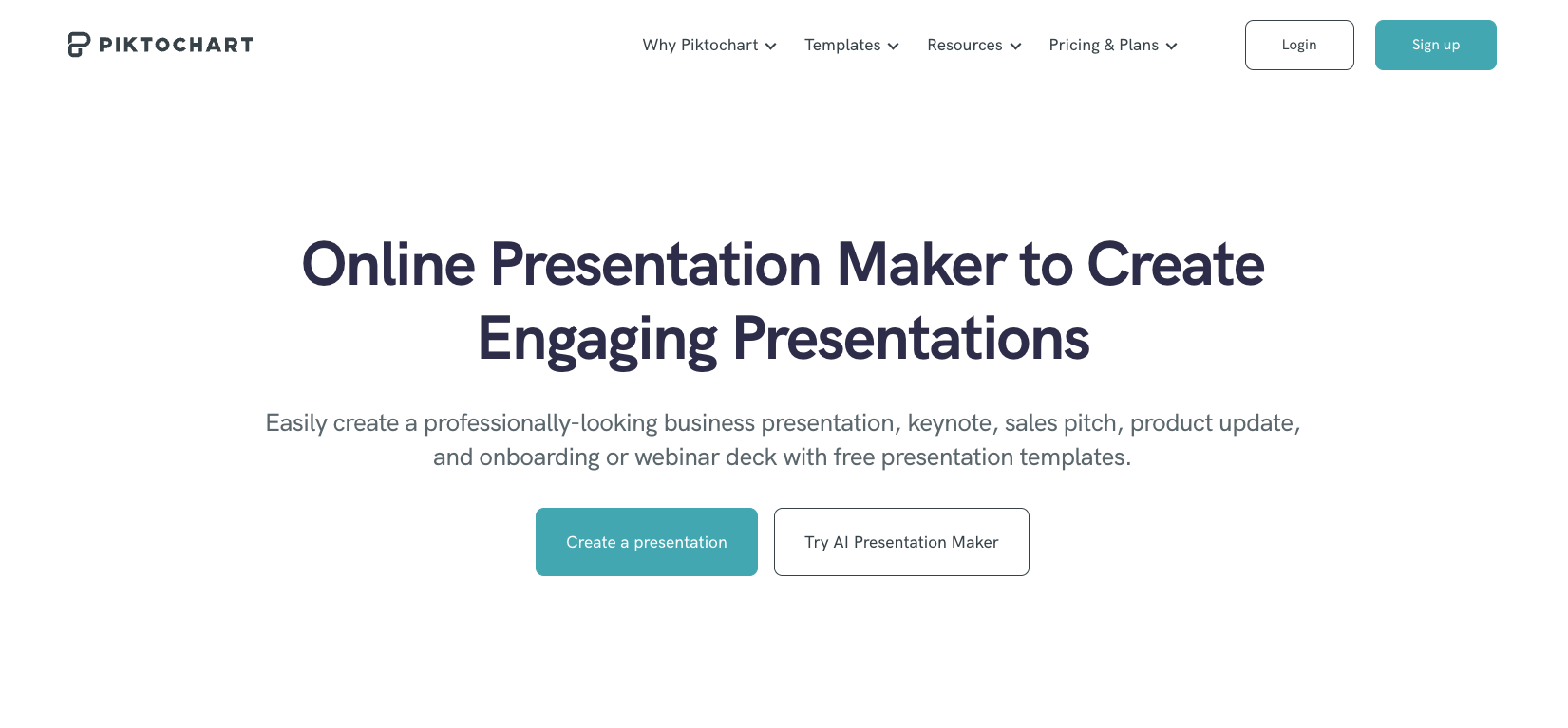 Piktochart is an online presentation and infographic maker with expertly designed templates and a drag-and-drop editor. An integrated media library filled with illustrations and stock images helps users build professional presentations quickly. Collaboration features are available on all plans.